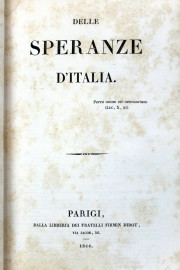 Lotto di due volumi: "Appunti di storia generale del Capitano Tancredi Fogliani", Modena, 1882; "Delle speranze d'Italia", Dalla libreria dei fratelli Firmin Didot, Parigi, 1844, (difetti).