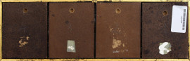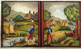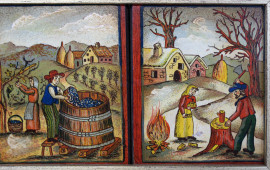 Lotto di quattro tavolette in legno raffiguranti le quattro stagioni, ingombro totale cm 13x41,5, XX secolo, entro un'unica cornice.