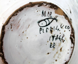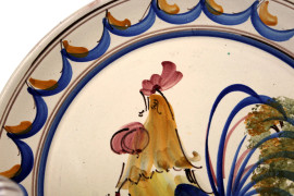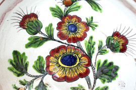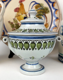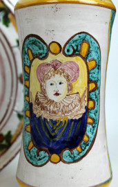 Lotto di sei oggetti in maiolica dipinta in policromia, composto da: un albarello, un vaso a quattro anse, una biscottiera, un centrotavola, una potiche ed un piatto, alt. max cm 25,5, manifatture diverse, XX secolo, (lievi difetti)
