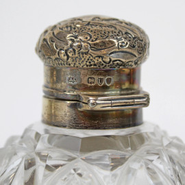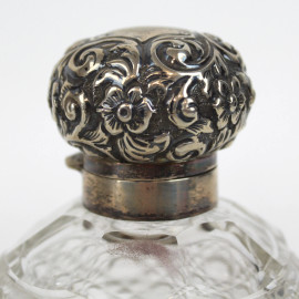 Lotto di tre bottigliette portaprofumo in cristallo controtagliato, tappi in argento, cm h 12, inizi XX secolo.