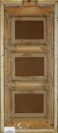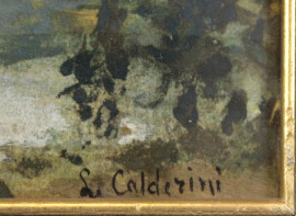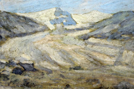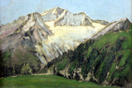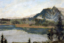 Lotto di tre paesaggi montani, olio su masonite, cm 15x20, firmati, entro un'unica cornice, (ingombro totale cm 71x31)