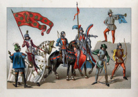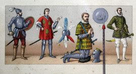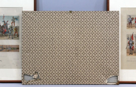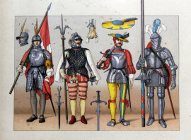 Lotto di tre stampe a colori raffiguranti armi ed armature del XV e XVI secolo, del Giappone e del Medioevo, cm 21x33, entro cornici.