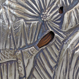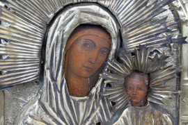 Madonna con Bambino, tempera su tavola, cm 38,5x29,5, con riza in metallo sbalzato, XIX secolo.