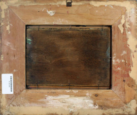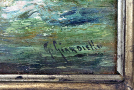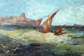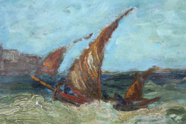 Marina con imbarcazioni, olio su tavola, cm 16,5x24, firmato, entro cornice.