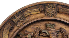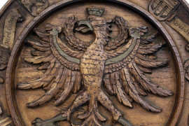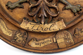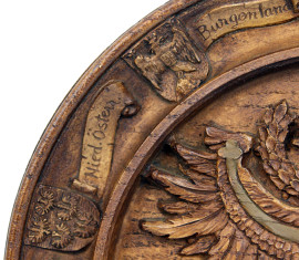 Medaglione in legno intagliato raffigurante aquila imperiale e vari stemmi delle regioni dell'Austria, diam. cm 22, XX secolo, (segni del tempo).
