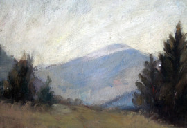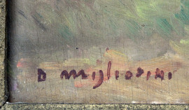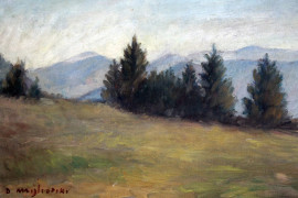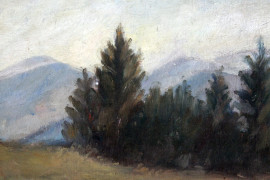 Paesaggio con alberi, olio su compensato, cm 35x45, firmato, entro cornice.