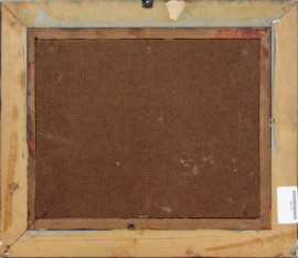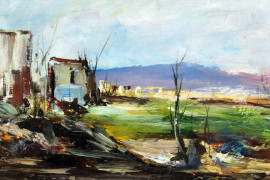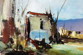 Paesaggio con case, olio su cartoncino, cm 27,5x34,5, firmato, entro cornice.