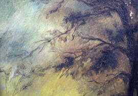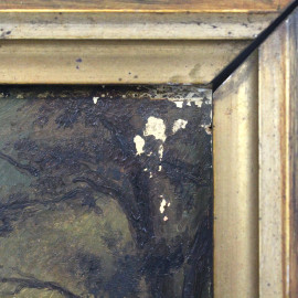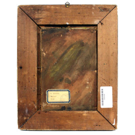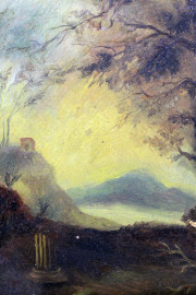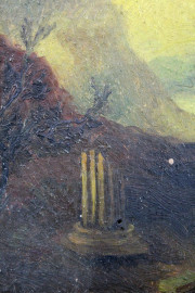 Paesaggio con rovine, olio su cartone, cm 22x14,5, inizi XX secolo, entro cornice, (difetti).