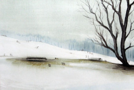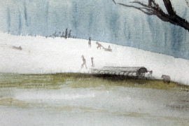 Paesaggio invernale, acquarello su carta, cm 35x50, firmato, entro cornice.