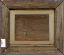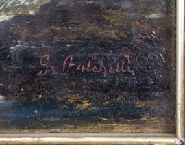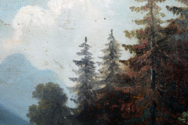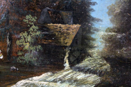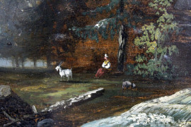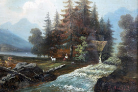 Paesaggio montano con fiume e pastorella, olio su tavola, cm 24x32, firmato, entro cornice.