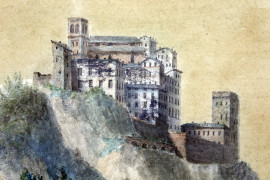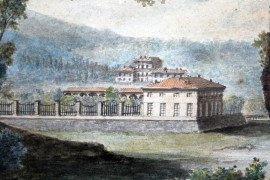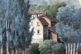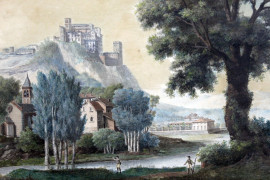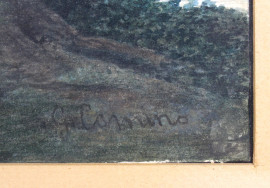 Paesaggio nordico con figure, acquarello su carta, cm 39x54, firmato, entro cornice.