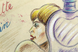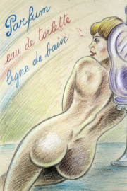Parfum eau de toilette ligne de bain, tecnica mista su carta, cm 31x24, firmato, entro cornice.