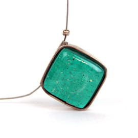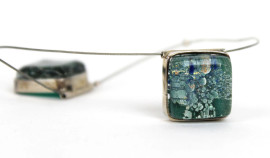 Parure collana e paio di orecchini di linea quatrata in vetro azzurro, lunghezza max cm 40.
