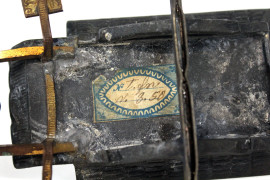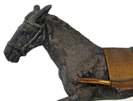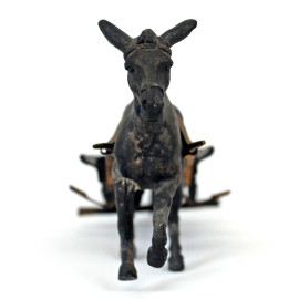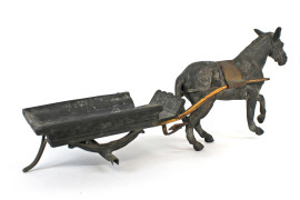 Piccola scultura raffigurante mulo con carro in ferro e metallo dorato, cm 9,5x22,5, XX secolo, (difetti).
