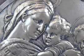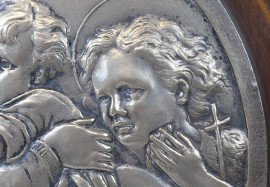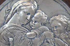 Placca in metallo raffigurante Madonna della Seggiola da Raffaello Sanzio (1483-1520), diam. cm 23, XX secolo.