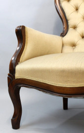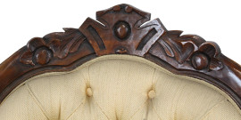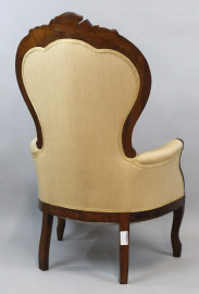 Poltrona in noce, XIX secolo, cimasa intagliata a motivi floreali, seduta e schienale imbottiti e rivestiti in stoffa avana con lavorazione capitonné, quattro gambe mosse, cm h 110, (segni del tempo).