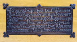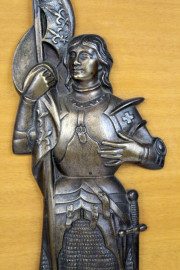 Quadro battesimale con figura di Giovanna d'Arco in armatura ed iscrizione a rilievo in bronzo, cm 39,5x30,5, XIX secolo, entro cornice.