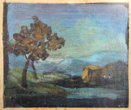 Quattro dipinti raffiguranti paesaggi, olio su tela, cm 8,5x10, entro un'unica cornice, (difetti).