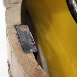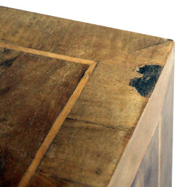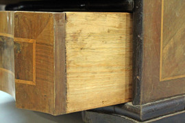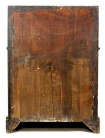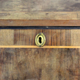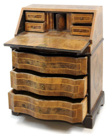 Ribaltina in noce e radica, XX secolo, filettatura in bosso, fronte a tre cassetti ed uno sportello a calatoia celante cassettini e segreti all'interno, cm h 93x68x46, (difetti).