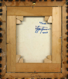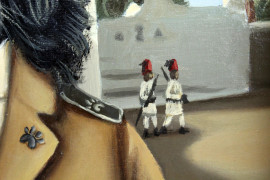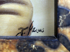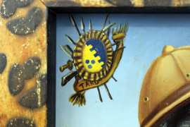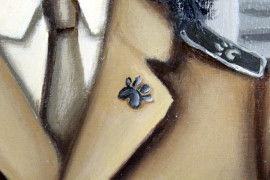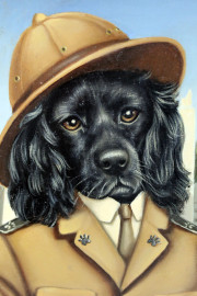 Ritratto di cane in divisa, olio su tela, cm 29,5x25, firmato Joyce Grams 2007, entro cornice.