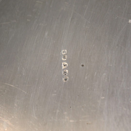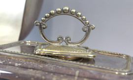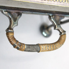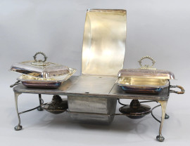 Scaldavivande triplo di linea rettangolare, piano ad uno scomparto centrale e due contenitori laterali con coperchi, poggiante su base con piedini a cipolla, cm 32x65x33, XX secolo, (segni del tempo).