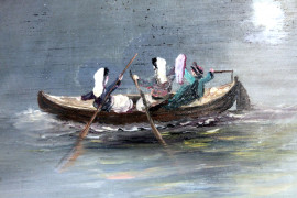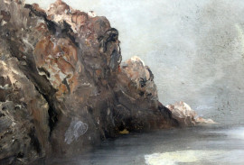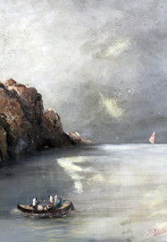 Scorcio costiero con imbarcazione, olio su tavola, cm 42x33, firmato, entro cornice.