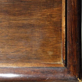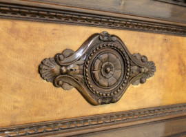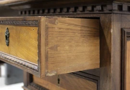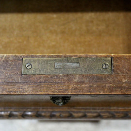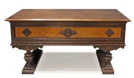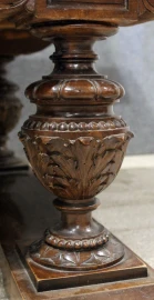 Scrivania in noce, XX secolo, piano di linea rettangolare, fascia con particolari dentellati e scolpiti a motivi floreali, fronte a quattro cassetti, quattro montanti scolpiti a foggia di vasi riuniti da coppia di traverse, cm h 83x170x91, (segni del tempo).