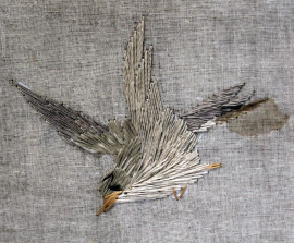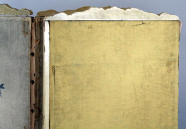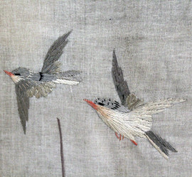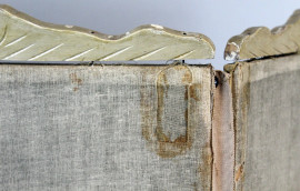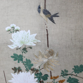 Separé a quattro ante, struttura in legno laccato, tessuto dipinto e ricamato motivi floreali e di volatili, cm h 138x195, prima metà XX secolo, (difetti).