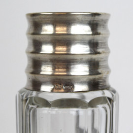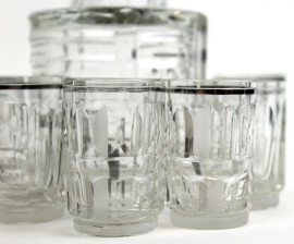 Servizio da liquore in cristallo, composto da una bottiglia e sei bicchierini, finiture in argento, alt. max cm 30