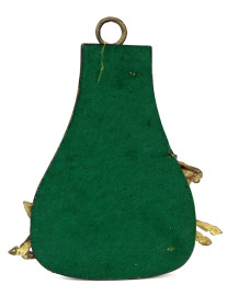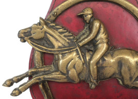 Staffa in legno ed ottone raffigurante fantino a cavallo, cm 26x21,5, (difetti).