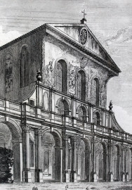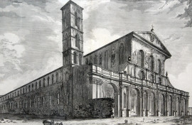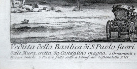 Stampa raffigurante "Veduta della Basilica di S.Paolo fuori delle mura eretta da Costantino Magno", cm 58x76, inventore Jean Barbault (1705-1766), disegnatore Freicenet (1725-1774), entro cornice.