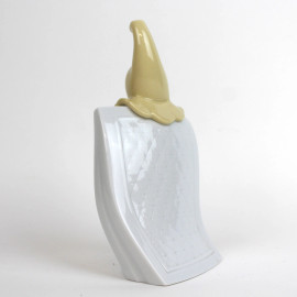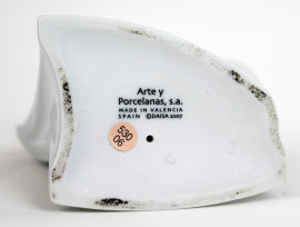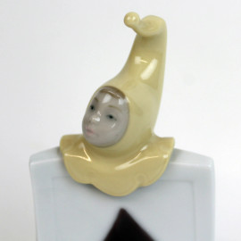 Statuina in porcellana policroma raffigurante fanciullo mascherato da asso di picche, cm h 16, marcata Arte y Porcelanas Valencia.