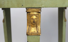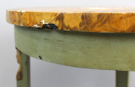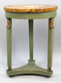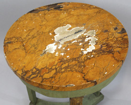 Tavolinetto da centro in legno laccato, XIX secolo, piano a finto marmo sorretto da tre montanti con particolari intagliati e dorati, cm h 56,5, diam. cm 43,5, (difetti).