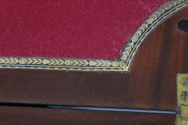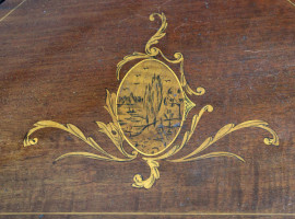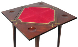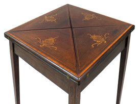 Tavolino da gioco a fazzoletto in noce, XIX secolo, piano intarsiato e rivestito in stoffa bordeaux, un cassetto nella fascia, poggiante su quattro gambe troncopiramidali su rotelle, cm h 74x55,5x55,5, (segni del tempo).