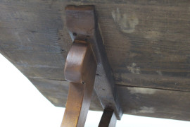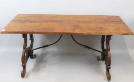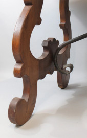 Tavolo fratino in noce, XX secolo, piano di linea rettangolare, montanti laterali intagliati a lira e raccordati da traverse sagomate in ferro, cm h 78x170x76, (segni del tempo).