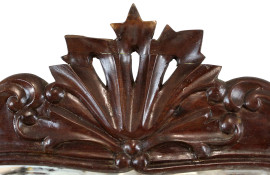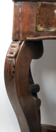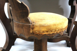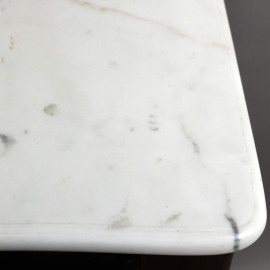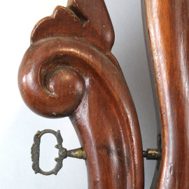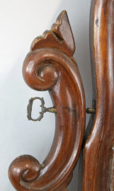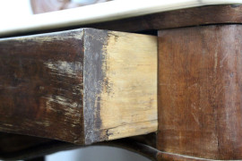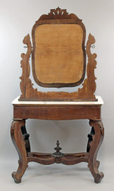 Toletta in noce, fine XIX secolo, piano in marmo sormontato da specchio, fronte ad un cassetto, poggiante su quattro gambe mosse riunite da crociata, cm h 185x90x43, completo di poltrona, (difetti).