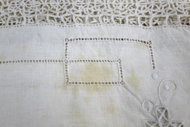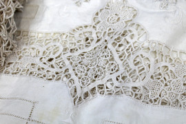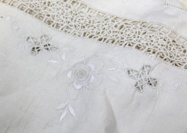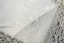 Tovaglia di linea rettangolare color ecru finemente ricamata, completa di undici tovaglioli, misure max cm 180x160.