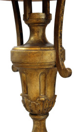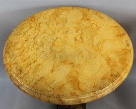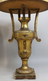 Tre tavolinetti tondi in legno dorato e laccato, XIX secolo, poggianti su basi a balaustro con particolari intagliati, piani di epoca diversa, cm h 74,5, diam. cm 56,5, (piccoli difetti).