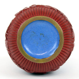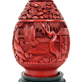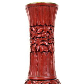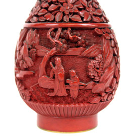 Vasetto in lacca rossa raffigurante personaggi e scene di vita quotidiana rese ad intaglio, cm h 22, arte orientale, inizi XX secolo, poggiante base circolare in legno.