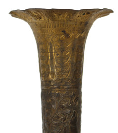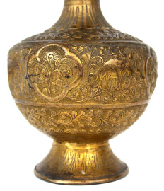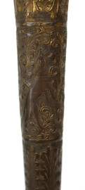 Vaso in ottone con decori a motivi floreali ed animali, cm h 39, arte orientale, metà XX secolo, (difetti).