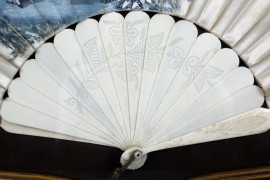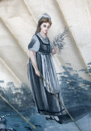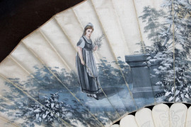 Ventaglio in seta dipinta raffigurante fanciulla, misure ingombro cm 40x67, inizi XX secolo, entro bacheca.