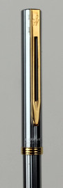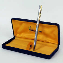Waterman, penna biro in metallo argentato con finiture dorate, lunghezza cm 14, entro custodia.