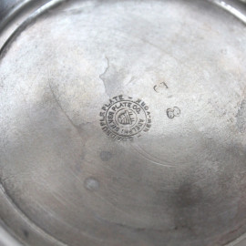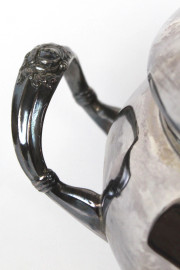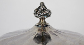 Zuppiera in metallo argentato, coperchio con presa a foggia di fiore, cm h 23, XX secolo, (segni del tempo).