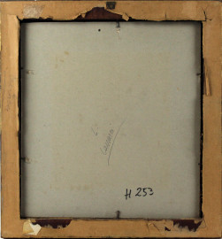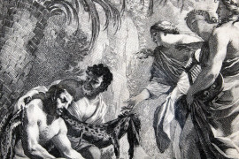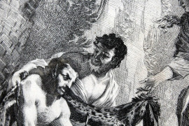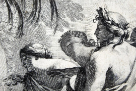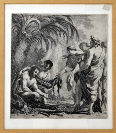 Antica incisione raffigurante Marsia sconfitto da Apollo, cm 22x19,5, entro cornice, (difetti).