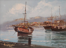 Antonio Giordano (XX sec.), Scorcio di porto, olio su tela, cm 28x38, entro cornice.