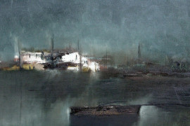 Costa con imbarcazione, olio su tela, cm 50x60, entro cornice.