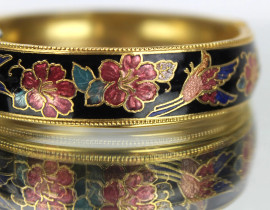 Bracciale rigido in metallo dorato e smalti policromi raffiguranti fiori e volatili.