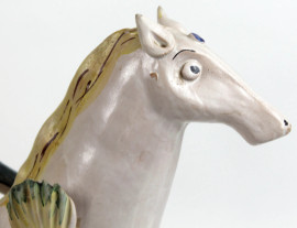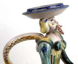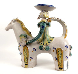 Cavaliere in ceramica dipinta a mano, altezza cm. 39,5, firmato Oronzo Patronelli Grottaglie, seconda metà XX secolo.