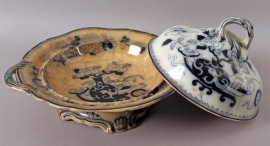 Centrotavola in maiolica bianca e blu a decoro orientale completo di coperchio, altezza 20 cm, diametro 32 cm. (lievi sbeccature).