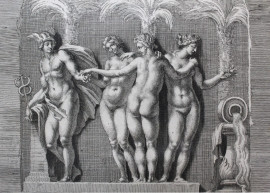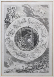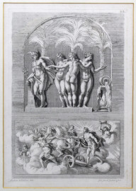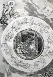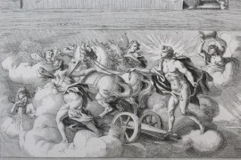 Coppia di incisioni da Joachim Sandrart raffiguranti il Carro di Apollo e i Segni zodiacali, cm. 34x23, XIX secolo, entro cornici.